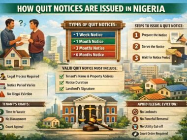 Read More Housing and Property How Quit Notices Are Issued in Nigeria: A Complete Guide for Tenants and LandlordsByDaniel OkoyeFebruary 9, 2026No comments In Nigeria, a quit notice is a formal written notice issued by a landlord to a tenant, informing… Read More