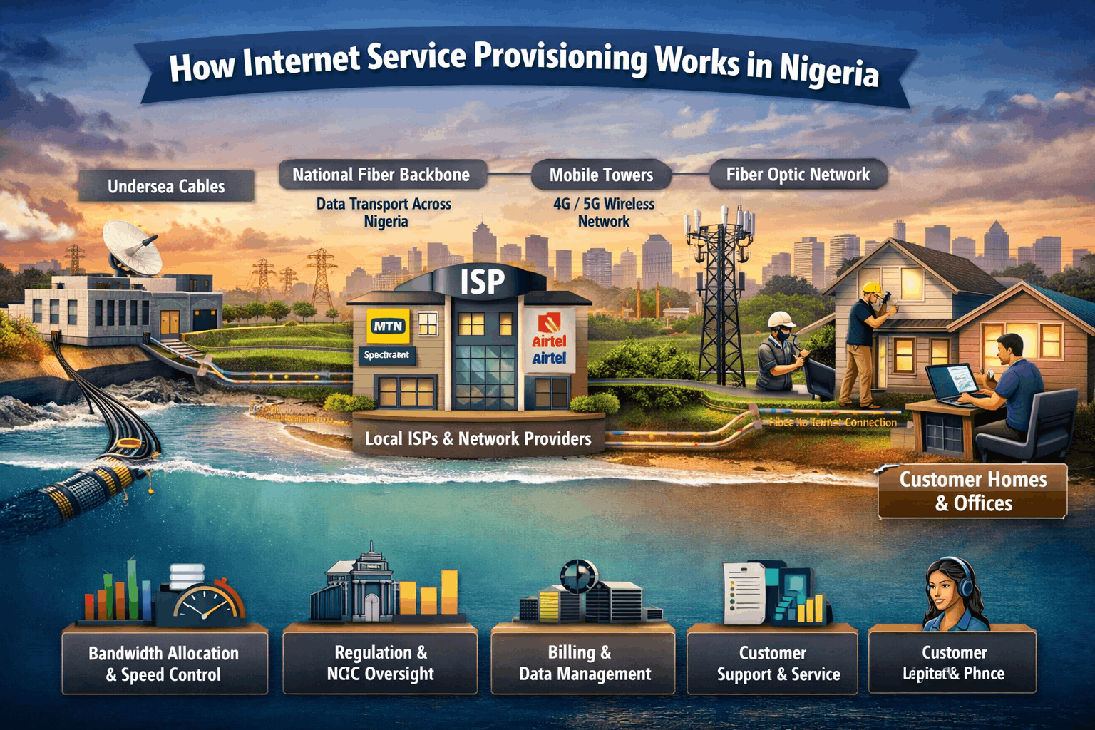 ISPs are the companies consumers deal with directly. Examples include mobile network operators like MTN and Airtel, as well as dedicated internet companies like Spectranet.